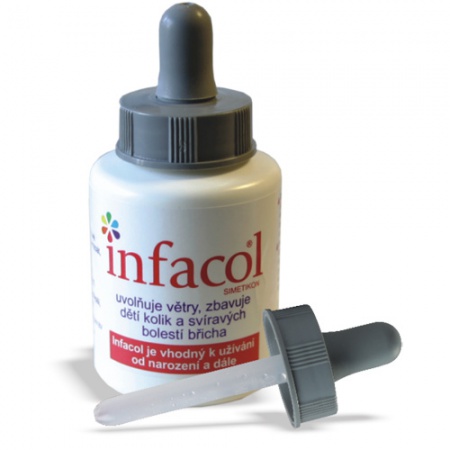 Infacol je volně prodejný přípravek proti nadýmání, který miminka snadno zbaví bolestí bříška. Suspenze Infacol fyziologickou cestou pomáhá snížit plynatost v žaludku a ve střevním traktu způsobenou polykáním vzduchu, zažívacími potížemi nebo některými potravinami. Během kojení a krmení spolykají miminka velké množství vzduchu, který je pak v žaludku přítomný ve formě drobných bublinek. Infacol promění malé bublinky na velké, čímž usnadní jejich vypuzování ven z těla formou větrů nebo říhání.